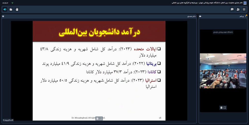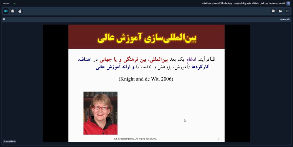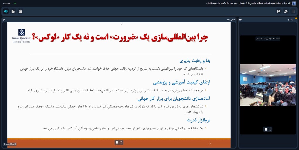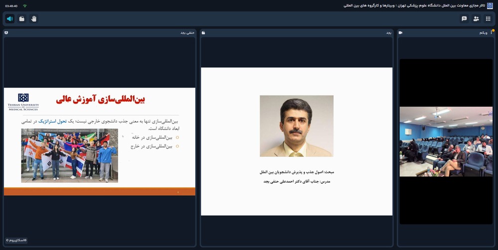 به گزارش روابط عمومی کالج بینالملل دانشگاه علوم پزشکی تهران، سومین روز از کارگاه «بینالمللیسازی آموزش عالی در علوم پزشکی» ویژه مدیران دانشگاه علوم پزشکی خراسان شمالی، روز شنبه دوازدهم مهرماه ۱۴۰۴ بهصورت آنلاین در بستر اسکایروم برگزار شد. این کارگاه با هدف ارتقای توانمندی مدیران و اعضای هیأت علمی در زمینه توسعه تعاملات علمی و آموزشی بینالمللی طراحی و اجرا گردید.