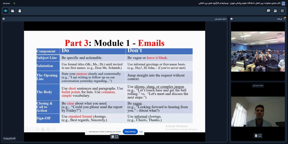 در پایان، دکتر سام سعیدیان مبحث «آموزش نگارش مکاتبات بینالمللی» را ارائه کرد. وی با تشریح مبانی نامهنگاری و نحوه تهیه ایمیلهای رسمی، اصول کاربردی در نگارش مکاتبات بینالمللی را برای مدیران و کارشناسان تبیین نمود.