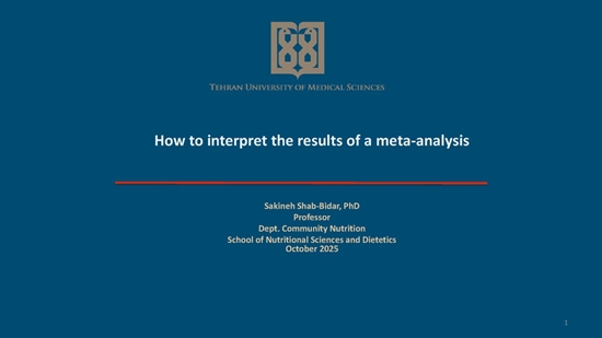 به گزارش روابط عمومی کالج بین‌الملل دانشگاه علوم پزشکی تهران، چهاردهمین کارگاه از سلسله کارگاه‌های پژوهشی ویژه دانشجویان بین‌الملل با عنوان "How to Perform a Meta-analysis" روز سه شنبه ۱۵ مهرماه ۱۴۰۴ از ساعت ۱۴ تا ۱۶ به‌صورت آنلاین برگزار شد. این کارگاه با تدریس دکتر سکینه شب بیدار و با حضور جمعی از دانشجویان بین‌المللی از کشورهای مختلف برگزار گردید.