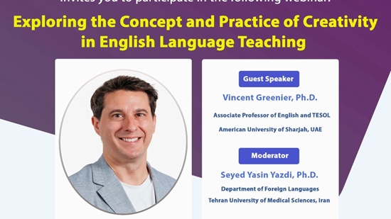 به گزارش روابط عمومی کالج بینالملل دانشگاه علوم پزشکی تهران، روز شنبه ۸ آذر ۱۴۰۴ (۲۹ نوامبر ۲۰۲۵) وبینار بینالمللی با موضوع «Exploring the Concept and Practice of Creativity in English Language Teaching» توسط گروه زبانهای خارجی کالج بینالملل با سخنرانی دکتر Vincent Greenier از دانشگاه American University of Sharjah امارات متحده عربی بهصورت مجازی در بستر اسکایروم برگزار خواهد شد. این وبینار با هدف ارتقای دانش زبانشناسی کاربردی و بررسی مفهوم خلاقیت در آموزش زبان انگلیسی، برنامهریزی شده است.