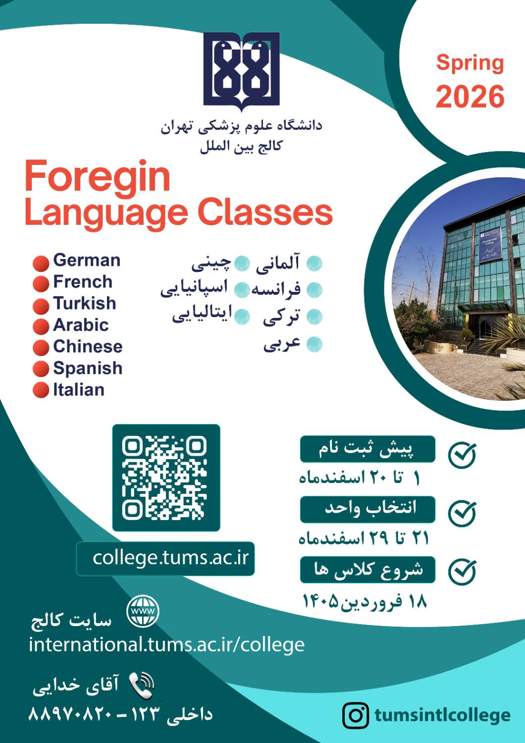 به گزارش روابط عمومی کالج بینالملل دانشگاه علوم پزشکی تهران، ثبتنام دورههای ترمیک آموزش زبانهای خارجی (غیر از انگلیسی) شامل آلمانی، فرانسه، ترکی، ایتالیایی، عربی، اسپانیایی و چینی در ترم بهار ۱۴۰۵ از تاریخ ۱ اسفندماه ۱۴۰۴ آغاز میشود. این دورهها با هدف ارتقای مهارتهای زبانی اعضای هیأت علمی، کارکنان و دانشجویان طراحی شده و شرکت متقاضیان آزاد نیز در این دورهها امکانپذیر است.