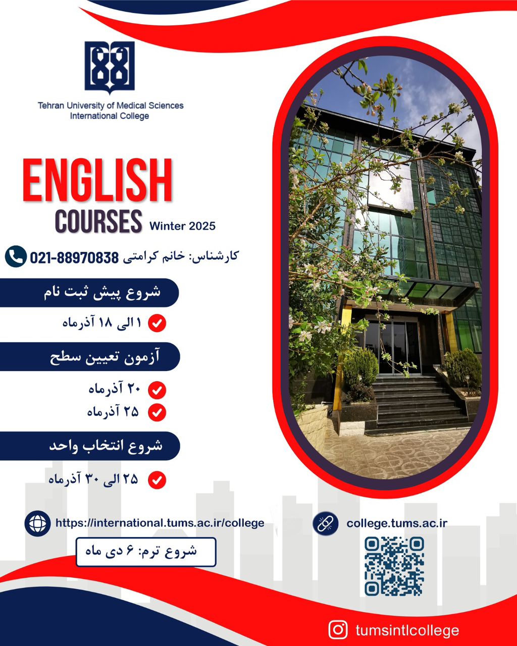 به گزارش روابط عمومی کالج بین الملل دانشگاه علوم پزشکی تهران، ثبت‌نام دوره‌های ترمیک آموزش زبان انگلیسی در ترم زمستان ۱۴۰۴ از تاریخ ۱ آذرماه آغاز می‌شود. این دوره‌ها با هدف ارتقای مهارت‌های زبانی اعضای هیأت علمی، کارکنان و خانواده‌های آن‌ها طراحی شده و شرکت متقاضیان آزاد نیز در این دوره‌ها امکان‌پذیر است.