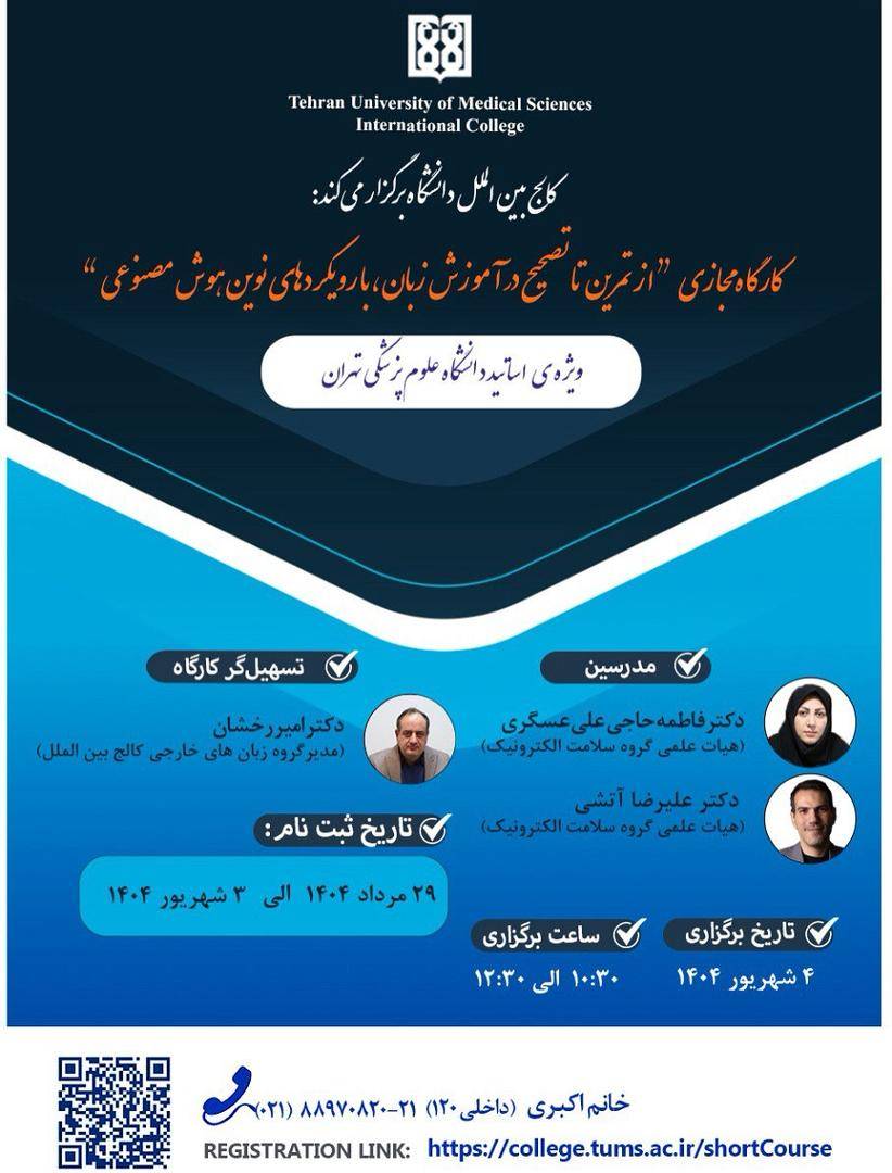 کالج بینالملل دانشگاه علوم پزشکی تهران کارگاه تخصصی با عنوان از تمرین تا تصحیح در آموزش زبان، با رویکردهای نوین هوش مصنوعی برگزار میکند.