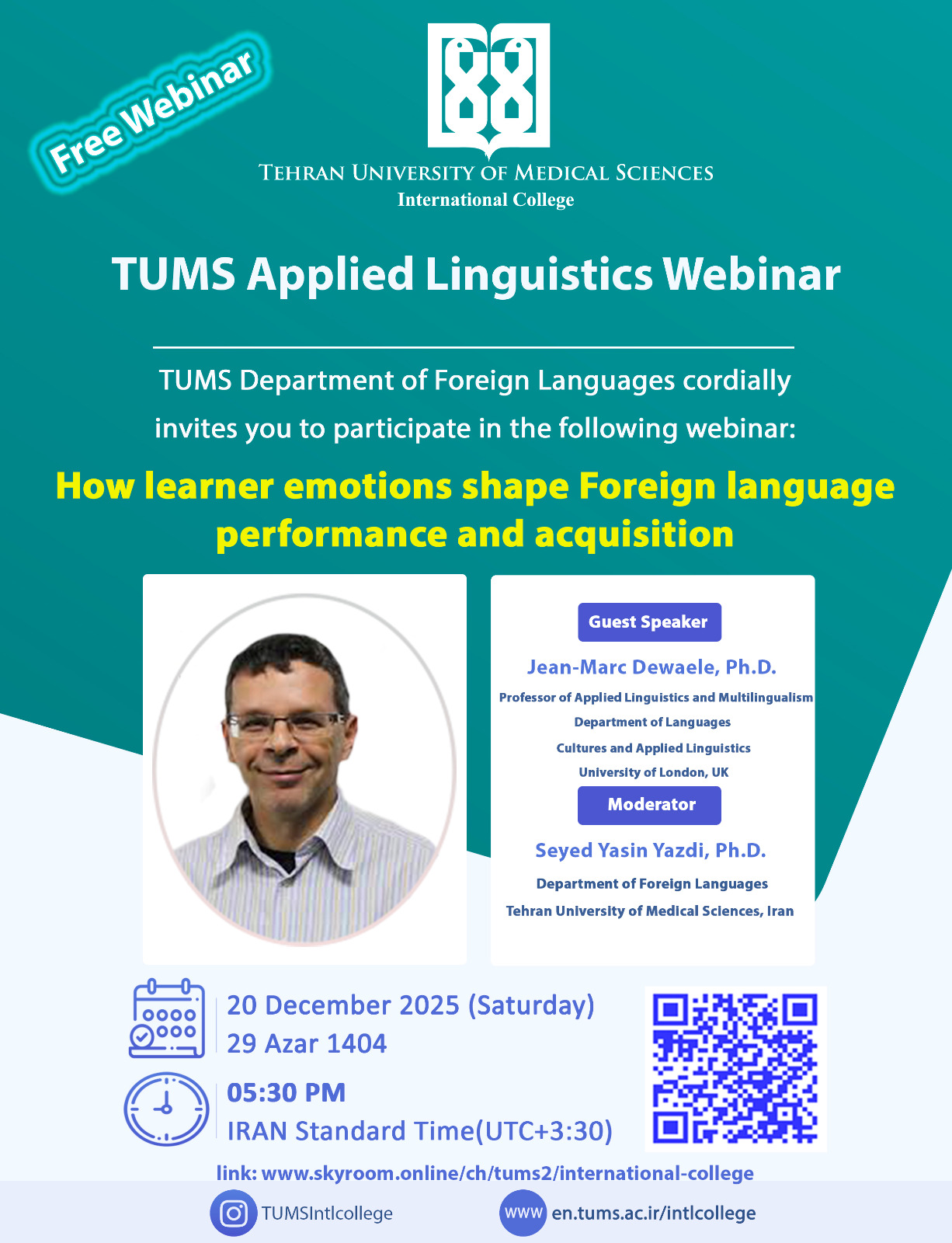 به گزارش روابط عمومی کالج بینالملل دانشگاه علوم پزشکی تهران، روز شنبه ۲۹ آذر ۱۴۰۴ (۲۰ دسامبر ۲۰۲۵) وبینار بینالمللی با موضوع How Learner Emotions Shape Foreign Language Performance and Acquisition توسط گروه زبانهای خارجی کالج بینالملل با سخنرانی پروفسور Jean-Marc Dewaele، استاد زبانشناسی کاربردی و چندزبانگی از دانشگاه لندن، انگلستان، بهصورت مجازی در بستر اسکایروم برگزار خواهد شد. این وبینار با هدف بررسی نقش کلیدی عواطف و هیجانات در فرآیند یادگیری و عملکرد زبان خارجی برنامهریزی شده است.